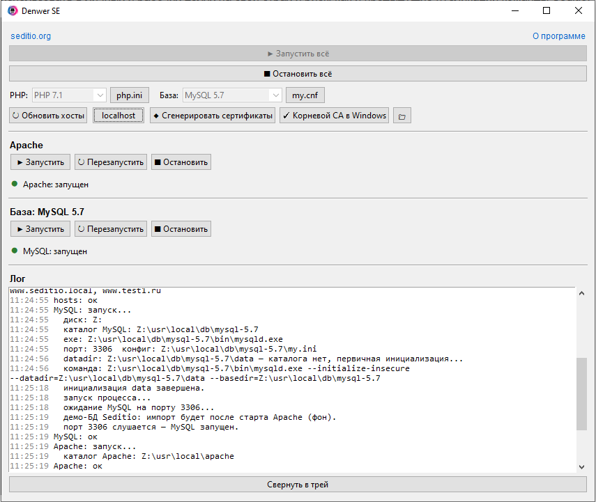 Denwer SE — это обновлённый комплект Denwer (Денвер) для локальной разработки под Windows: Apache, PHP (несколько версий в одной установке), MySQL и/или MariaDB, вспомогательные утилиты и универсальная панель запуска DenwerSE (исполняемый файл DenwerSE.exe). Сборка неофициальная; её можно свободно использовать в личных и рабочих целях на свой страх и риск, как и предыдущие публикации команды Seditio.
